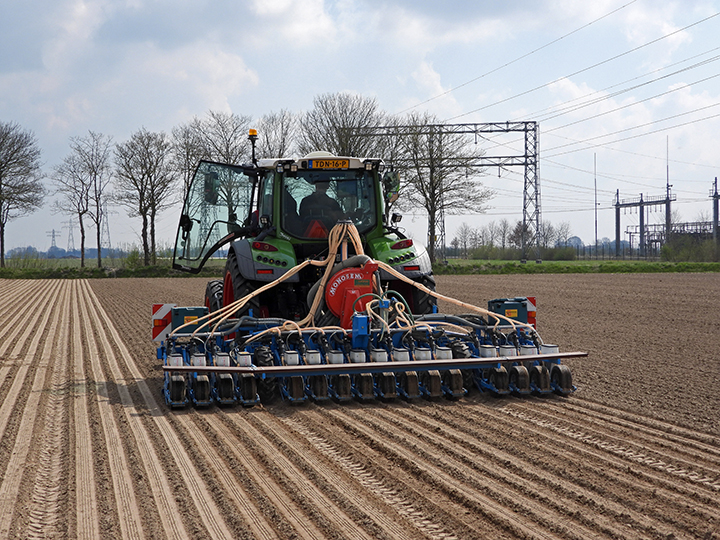 Voor het zaaien van uien werken wij met 2 × 2,25 meter en een scherp kouter voor een gelijkmatige verdeling. De machine is voorzien van RVS aandrukrollen en speciale luchtbanden die het zaaiwerk strak en egaal aandrukken.